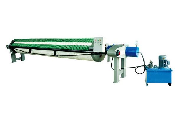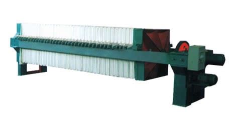 隔膜壓濾機(jī),隔膜壓榨壓濾機(jī)由隔膜板和廂式濾板排列組成濾室,在輸料泵的壓力作用下將漿料輸入濾室,通過過濾介質(zhì)(濾布)將濾料中的固體和液體分離,當(dāng)漿料中的固體形成餅后,再向隔膜通入空氣,對濾室內(nèi)的固體充分壓榨,降低含水率。對于粘性物料的過濾及對含水率要求較高的用戶,此機(jī)更有其獨特的特性。